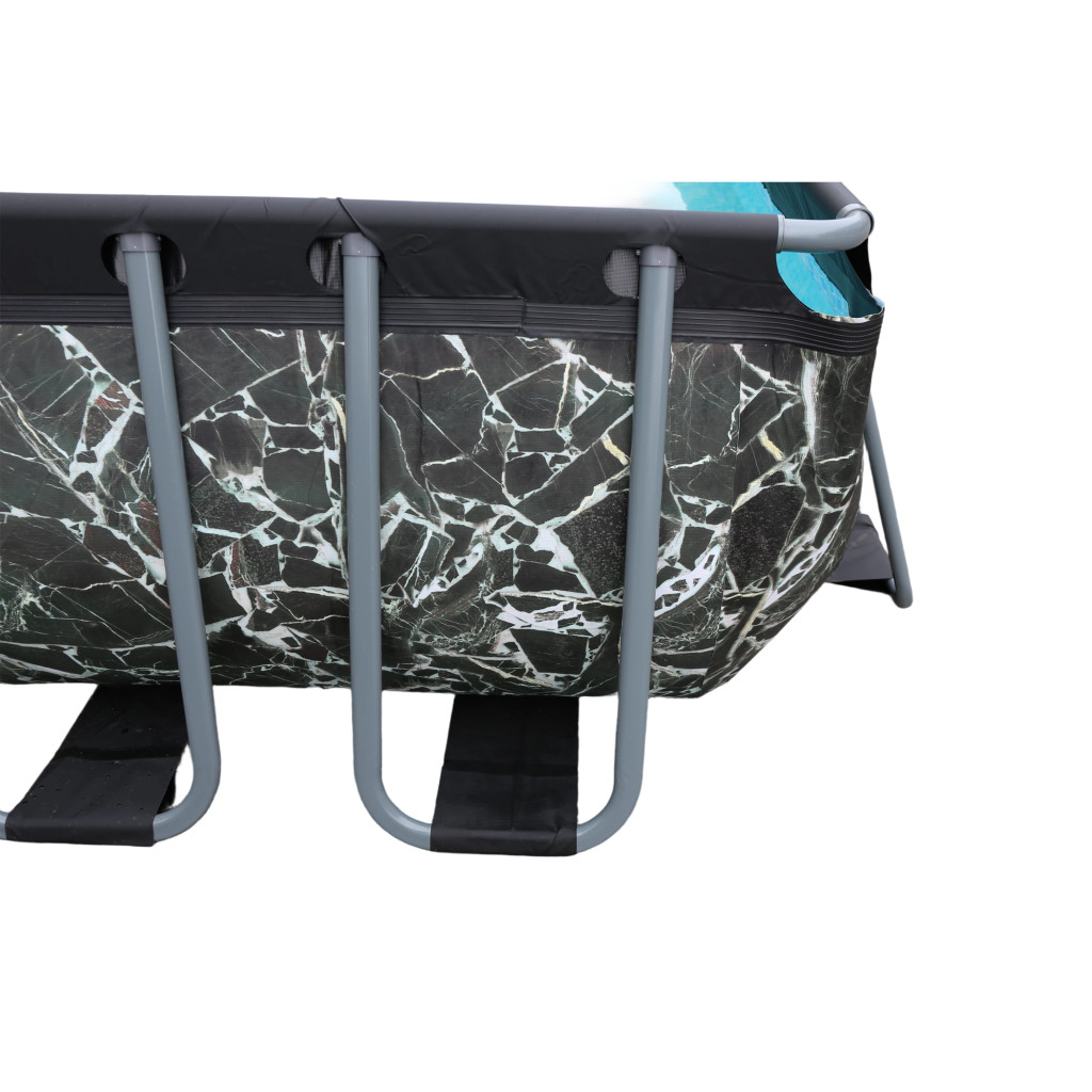 A medence felállítása gyors az egyszerű acélrúdrendszernek köszönhetően. Az oldalfalak és az alap háromrétegű megerősített anyagból készül, amely tartós és strapabíró, és hosszú élettartamot biztosít. A medenceszett papírszűrős vízforgató berendezéssel ellátott.