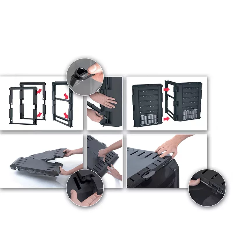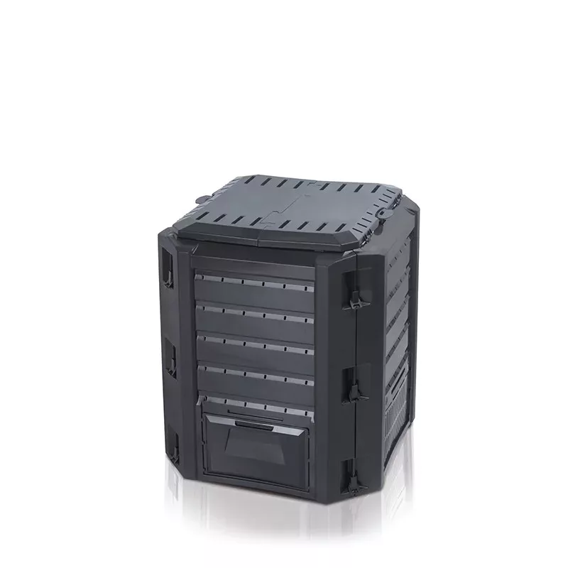 A 380 literes komposztáló ideális választás kisebb kertekhez vagy háztartásokhoz, ahol fontos a fenntartható hulladékkezelés. Tartós, időjárásálló műanyagból készült, amely hosszú távon ellenáll az UV-sugárzásnak és a nedvességnek. A jól kialakított szellőzőnyílások gyorsítják a lebomlási folyamatot, míg az alsó hozzáférési pont megkönnyíti a kész komposzt kinyerését.